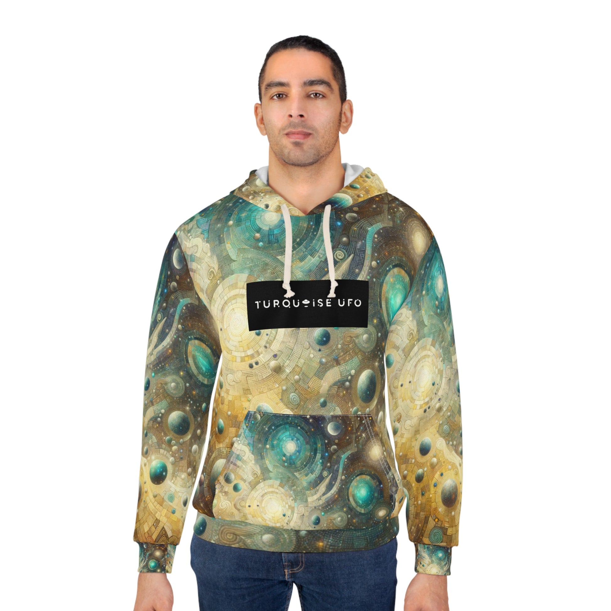A deep space themed Turquoise UFO Hoodie that gives off a futuristic and out-of-this-world vibe. Perfect for those who love all things space-related and want to stand out with a bold design. Ideal for wearing during sci-fi conventions, Halloween, or just lounging at home.