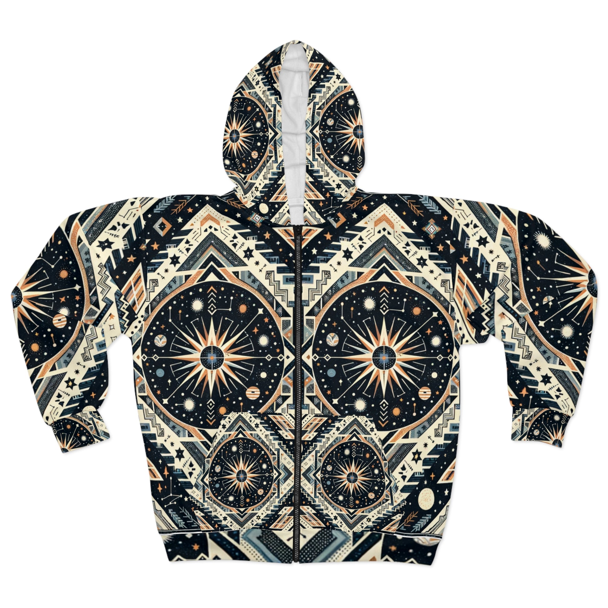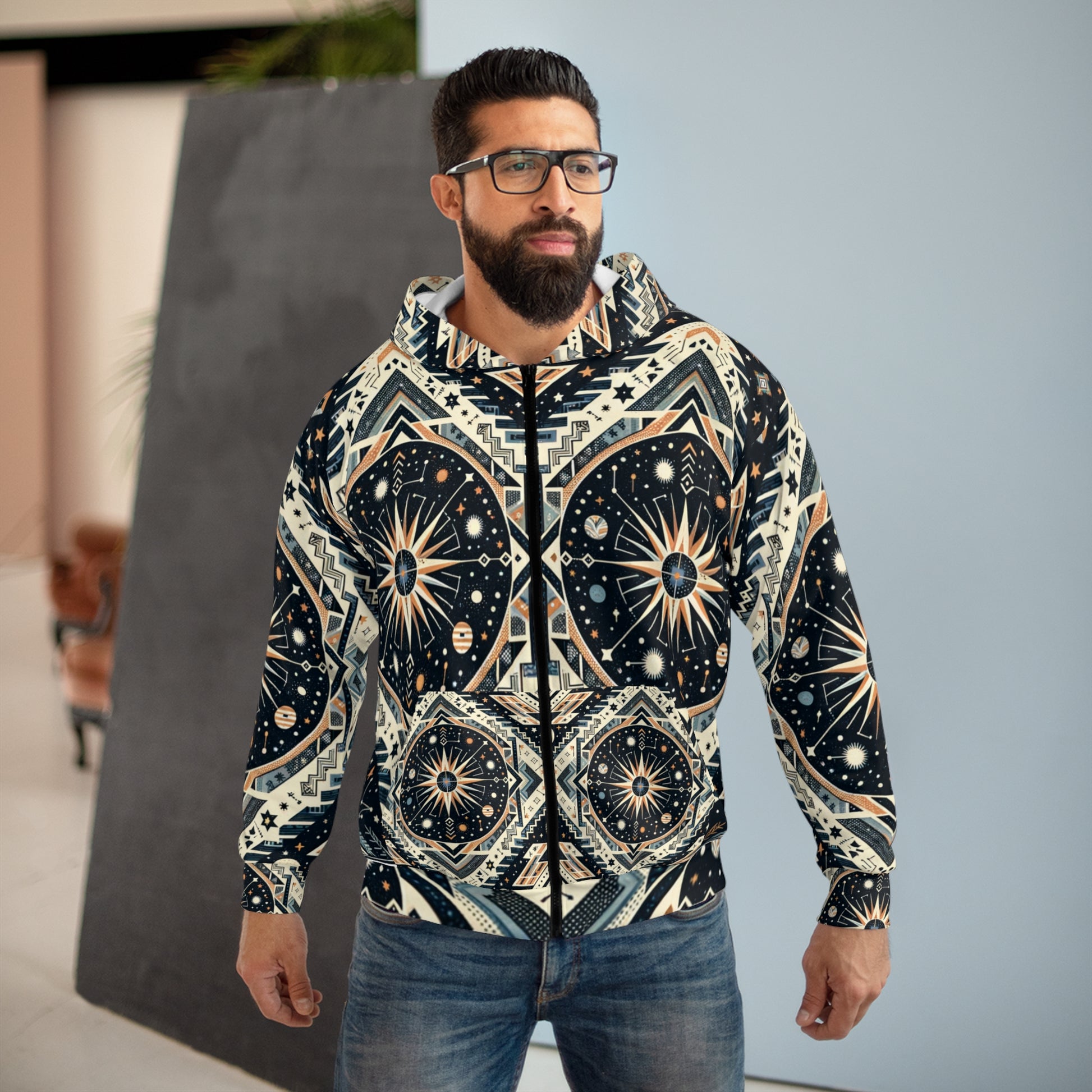 #CosmicHoodie #GalaxyPrint #SouthwesternStyle #StarryFashion #CelestialClothing #UniquePattern #DetailedDesign #ComfortableWear #FashionStatement #EyeCatchingStyle