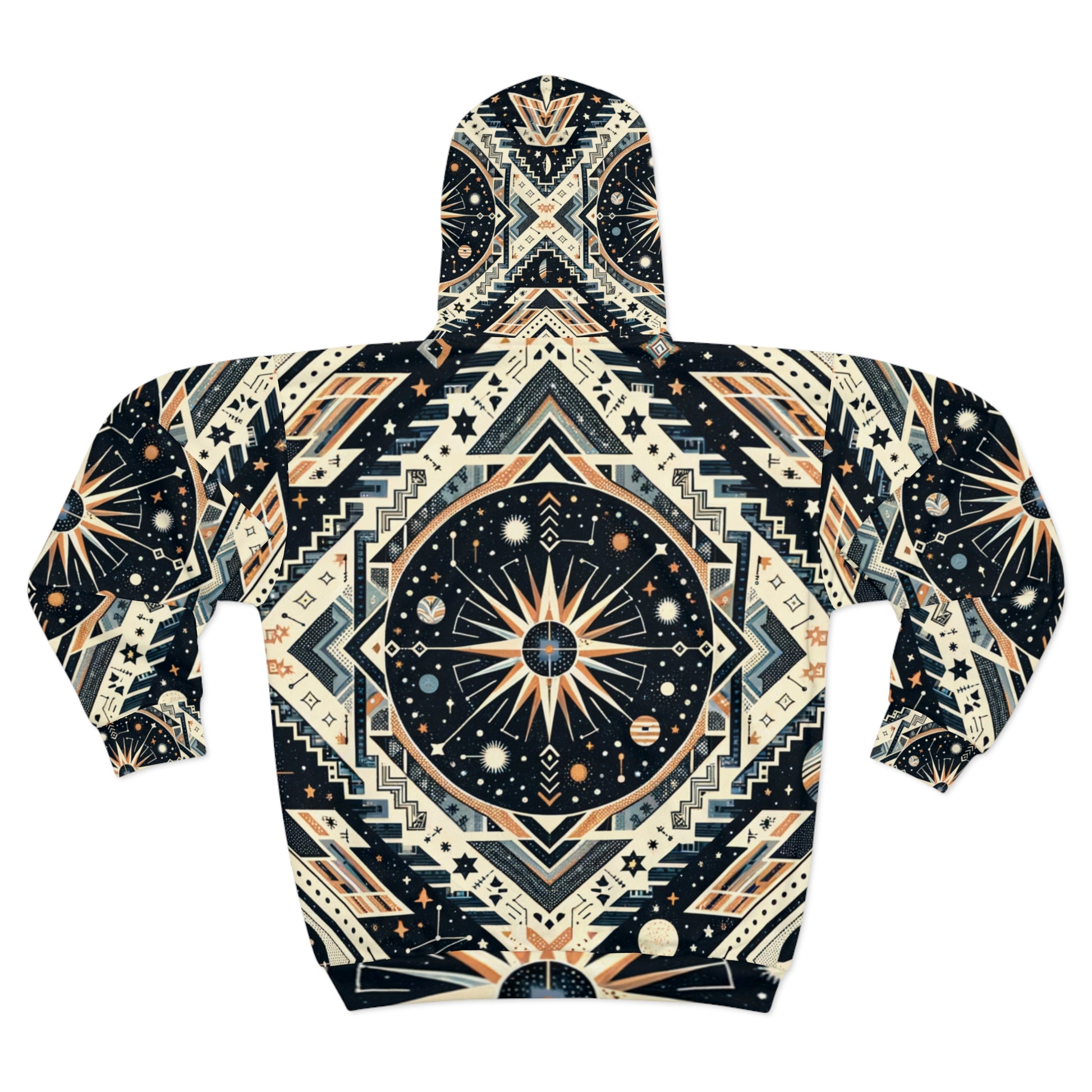 Explore the cosmos in style with this detailed hoodie. Our cosmic pattern showcases stars, galaxies, constellations, and Southwestern Chevron lines. This vibrant design has no central focal point, inviting endless exploration. It is as pleasing to the eye as it is comfortable to wear.