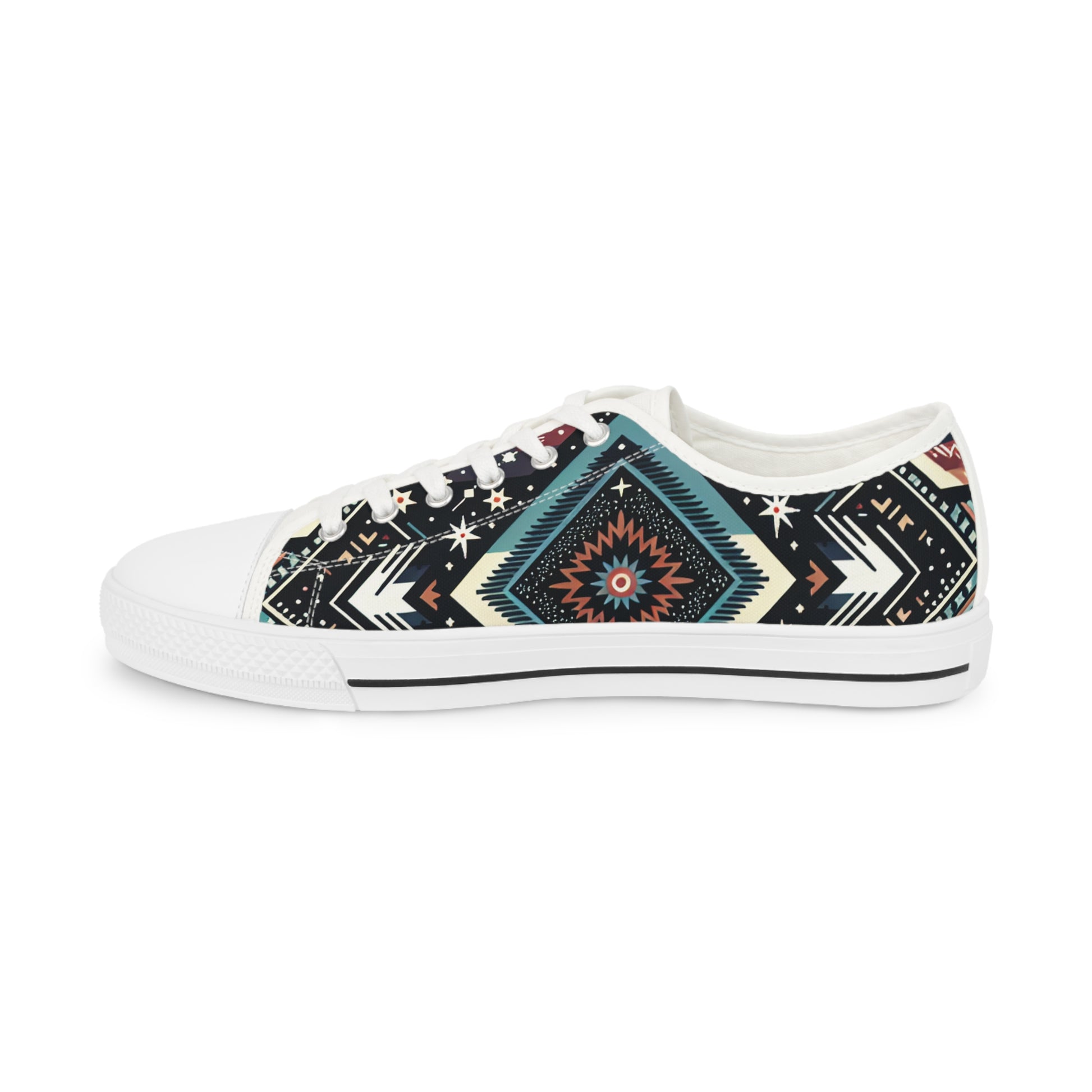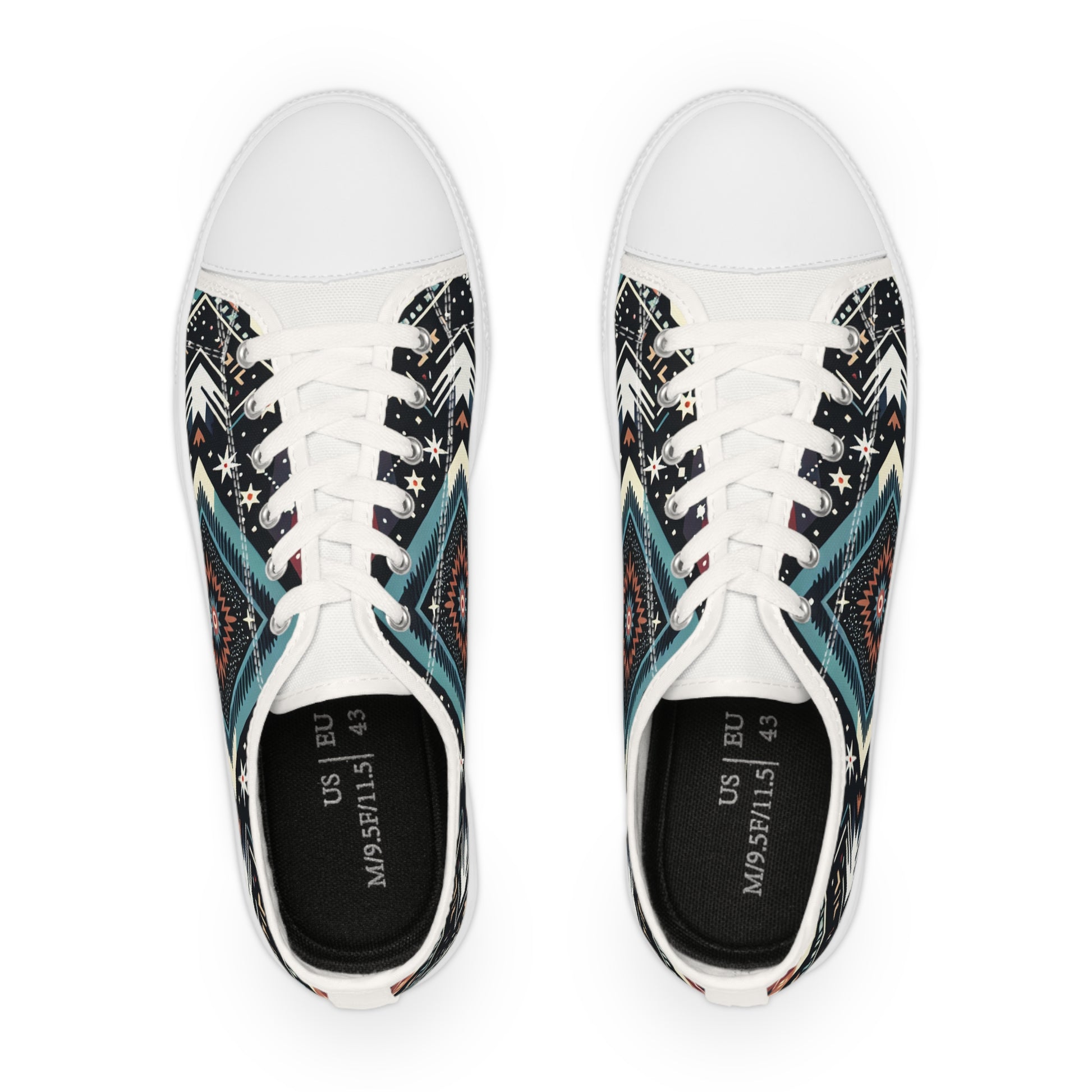 Experience the universe with our cosmically designed low top sneakers. They showcase a stunning fusion of celestial patterns and Earthly southwestern motifs. Let the vibrant colors mimicking the starry night sky captivate you. Don the galaxies as part of your style. #LowTopSneakers #CosmicDesign #StellarStyle #GalaxyFootwear #SouthwesternInspired #VibrantColors #ChevronLines #FashionableFootwear #ModernDesign #StarStuddedSneakers