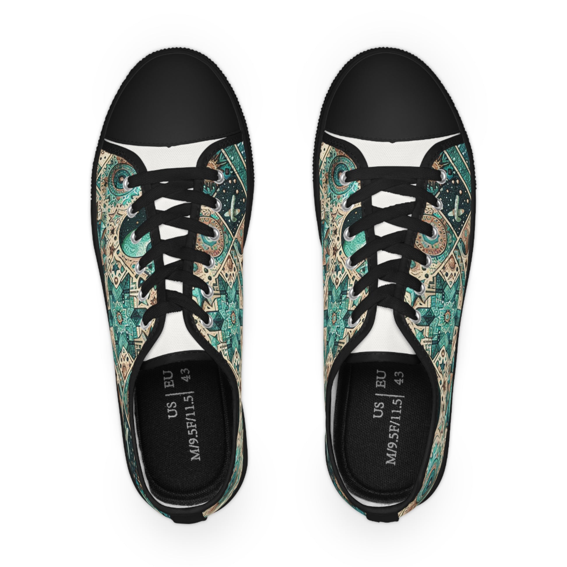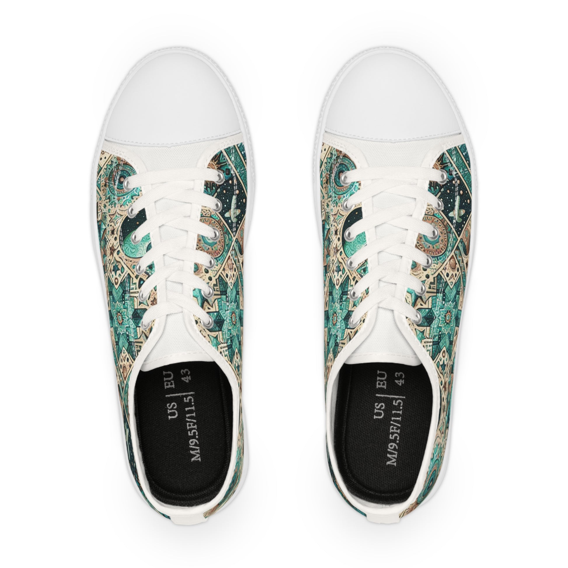 Discover our galaxy-inspired Low Top Sneakers! Adorned with a detailed pattern of turquoise cosmic elements like stars, galaxies, nebulae, and planets. Seamlessly integrated with elements from the Southwestern Chevron pattern for that earthy touch. Its busy, no-focus-point design keeps viewers entranced while maintaining a celestial theme that looks quilted and aesthetically undeniably pleasing.