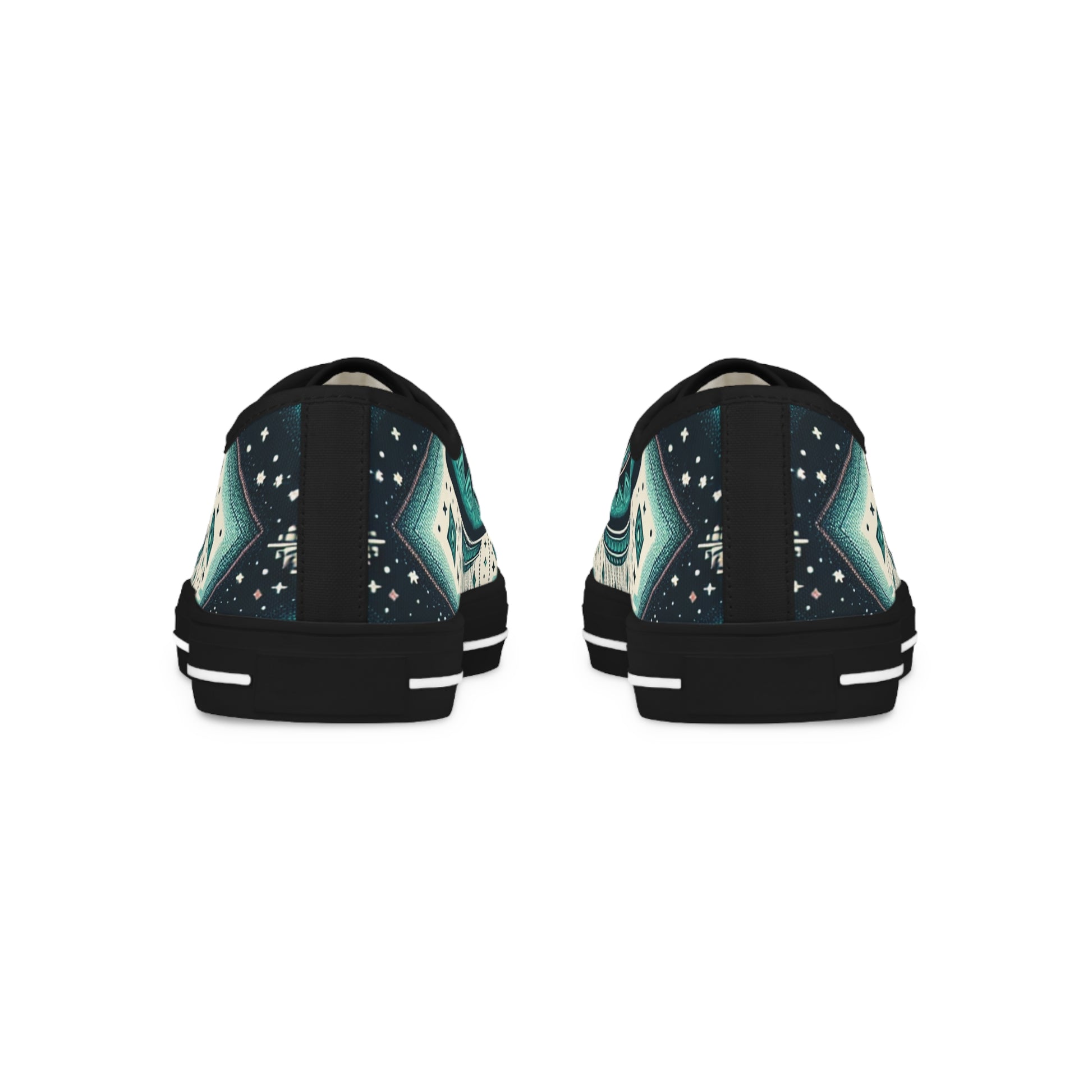 Experience an interstellar journey with our low-top sneakers featuring a captivating cosmic pattern. Popping over an astral backdrop are the striking turquoise UFOs & intricate Southwest Chevron designs, transporting you to infinite universes on every step. #CosmicSneakers #TurquoiseUFO #GalacticStyle #StellarJourney #ChevronDesign #InfiniteUniverse #AstralBackdrop #InterstellarJourney #WalkingOnStars #SneakersToInfinity