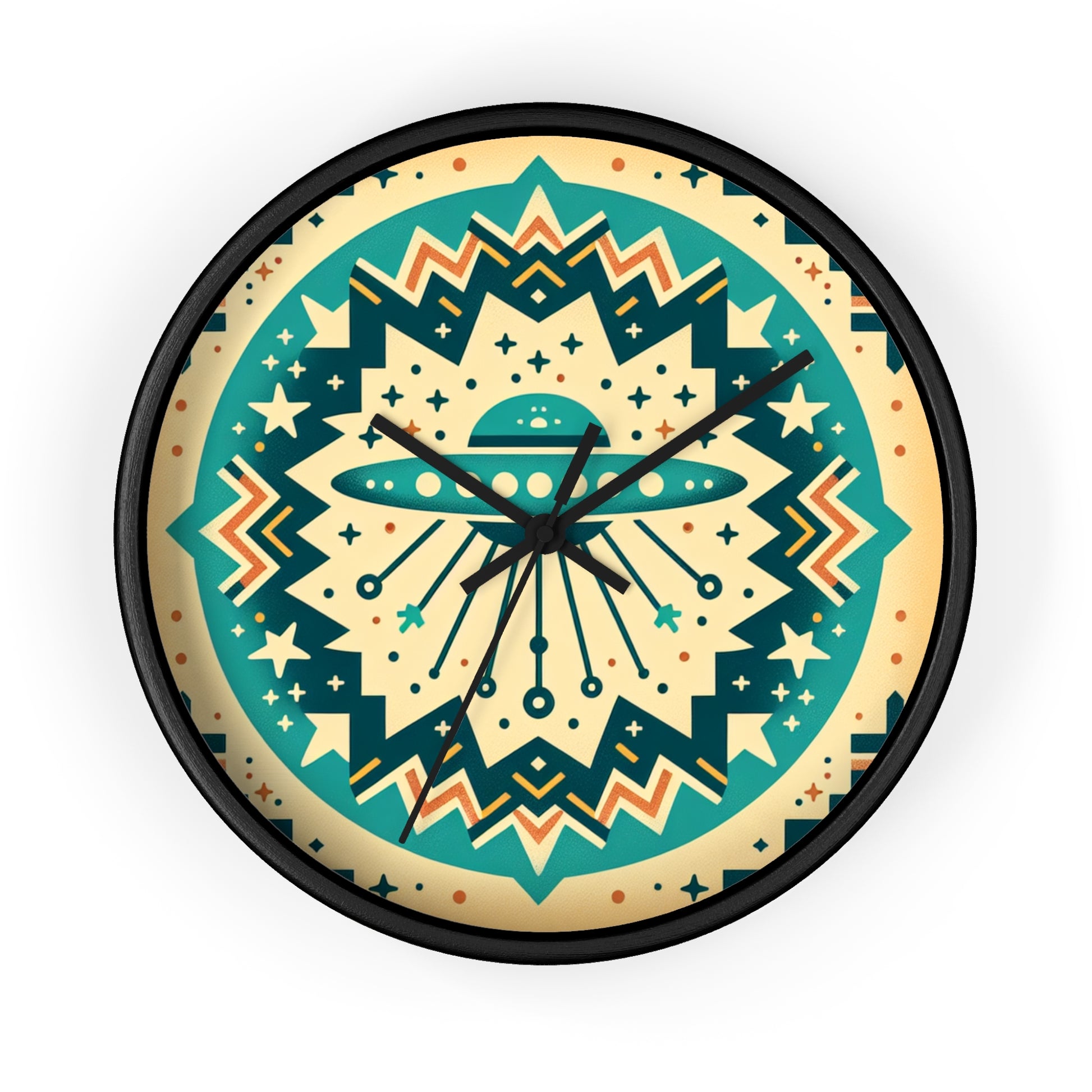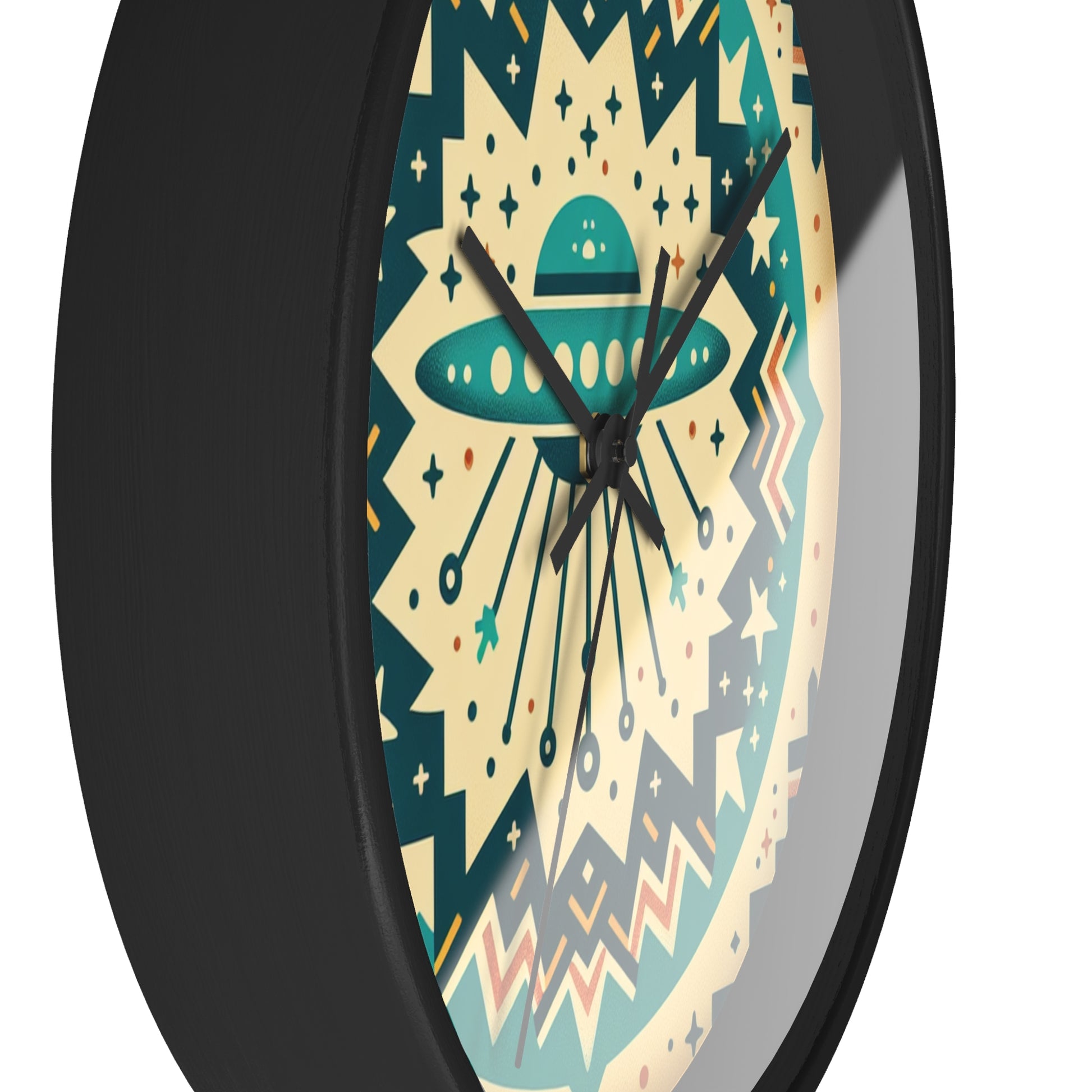 Discover our Cosmic UFO Wall Clock, a unique blend of Southwestern Chevron lines, turquoise UFO themes, and an interstellar array of stars, galaxies, and constellations. Immerse your room with the cosmic beauty held in its timeless turquoise, mustard yellow, and coral red hues. #TurquoiseUFO #ChevronClock #SouthwesternStyle #CosmicDecor #GalaxyDesign #ConstellationClock #SpaceThemedInteriors #MustardYellow #CoralRed #HomeDecor