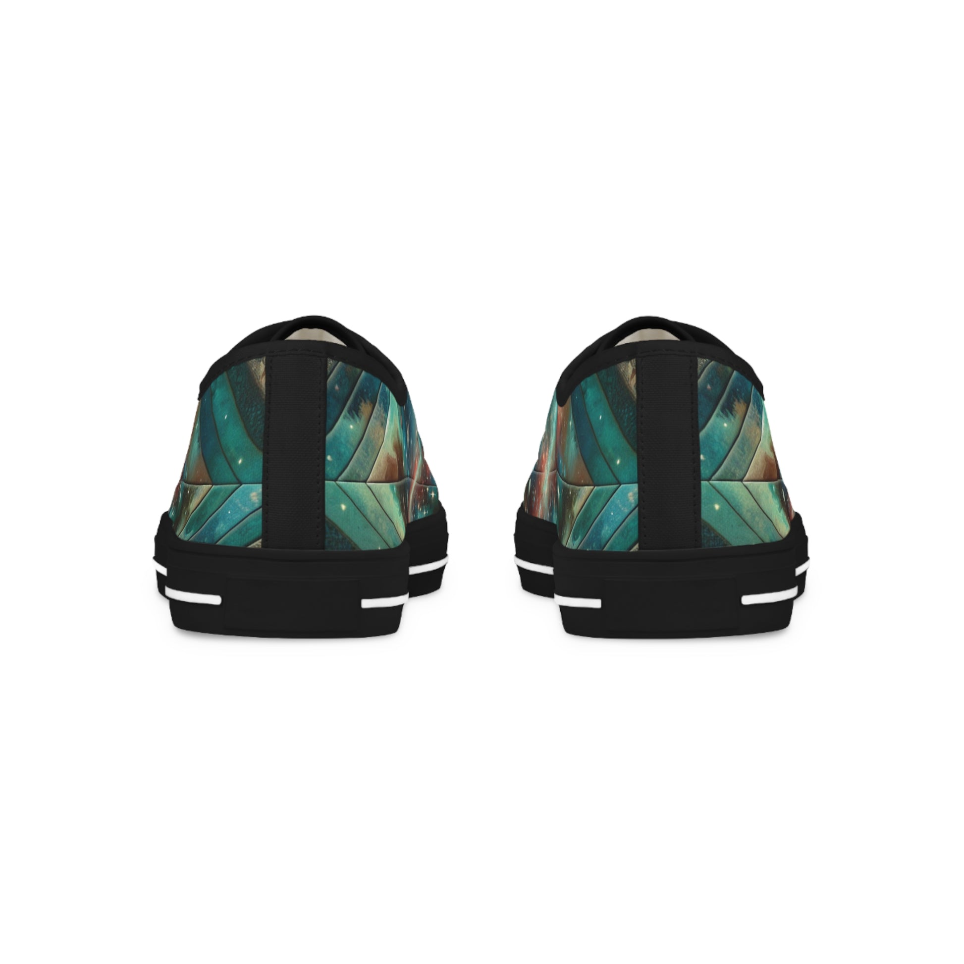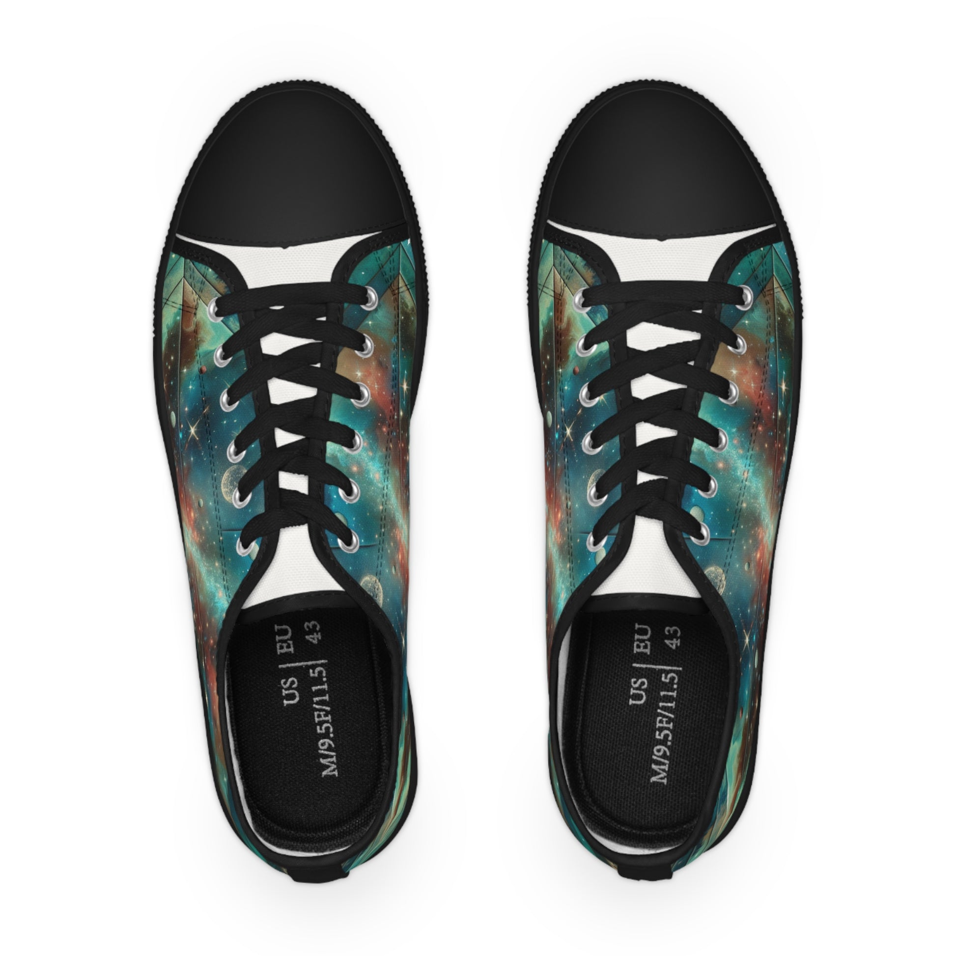 "Experience the cosmos beneath your feet in our low top sneakers. Radiant with a turquoise, earthy cosmic quilted pattern adorned with detailed, harmonious celestial elements. Balanced by Southwestern Chevron lines, they add a stargazing charm. Perfect for those who tread the line between style and cosmos. #LowTopSneakers #UniverseDesign #CelestialPrint #StarGazing #QuiltedPattern #CosmicShoes #GalaxyFootwear #NebulaPattern #ChevronLines #SouthwesternDesign"