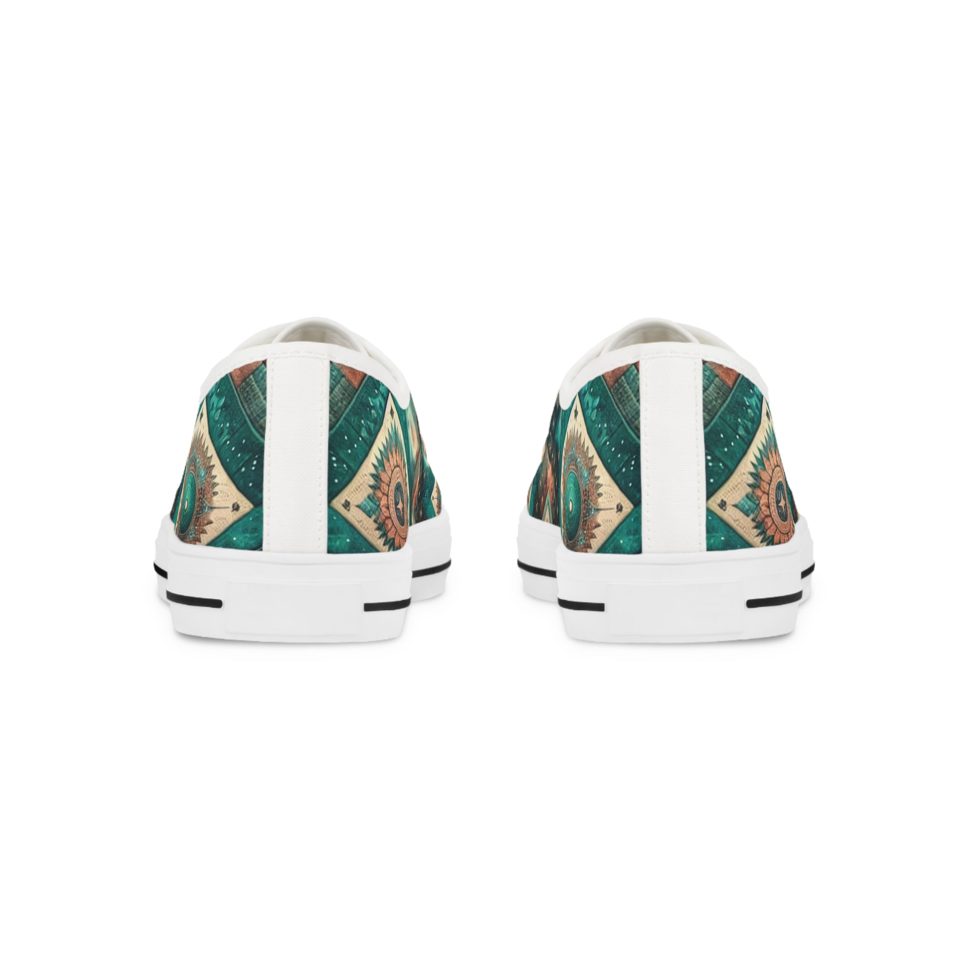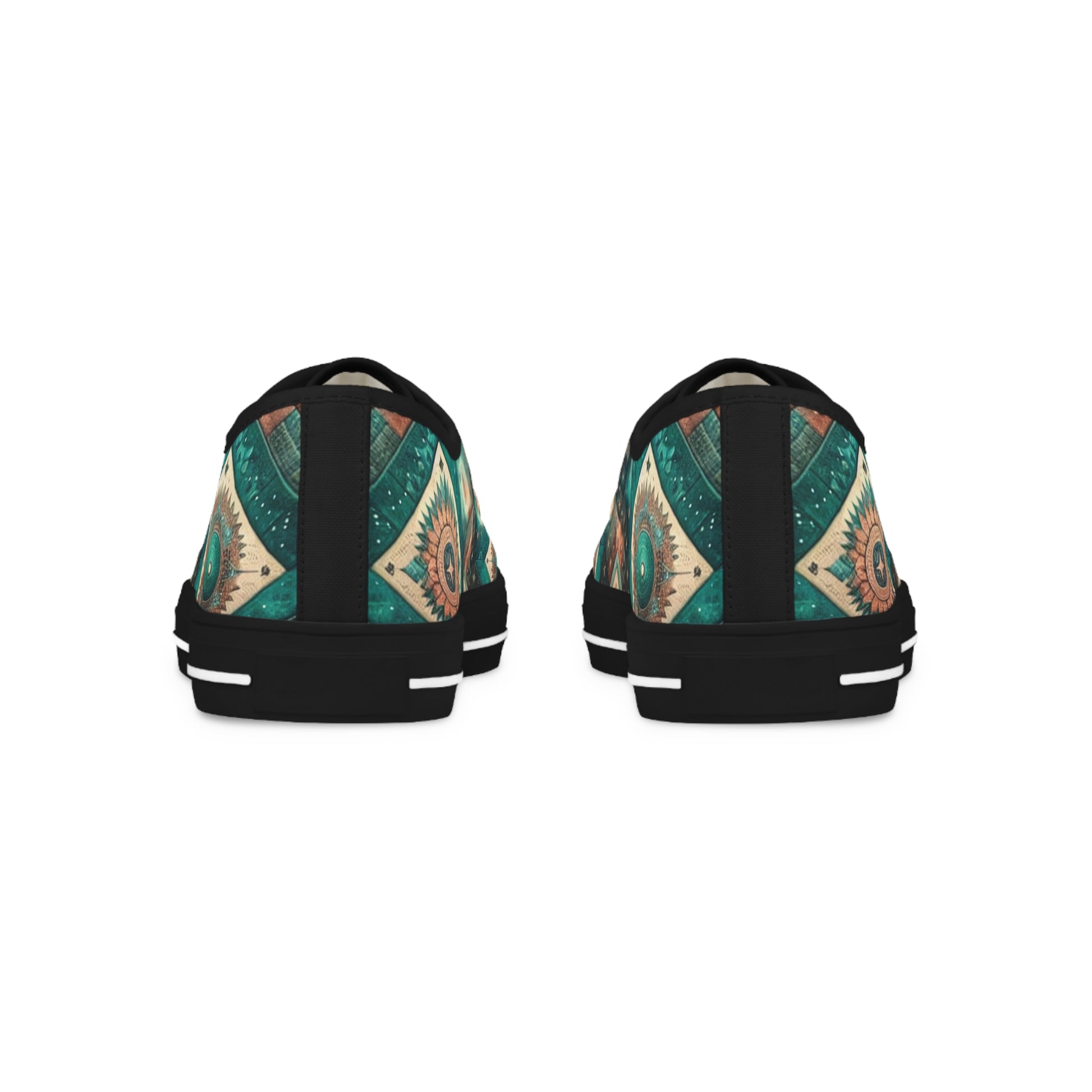 Discover our Earthy Cosmic Low Top Sneakers, imbued with a vibrant turquoise tone. The quilted pattern is a star-speckled homage to the cosmos, densely packed with celestial elements like galaxies, nebulaes, and far-off planets. Enhanced by Southwestern Chevron lines, the design evokes the beauty and chaos of the universe. No central focal point; instead, each glance promises a new discovery!
