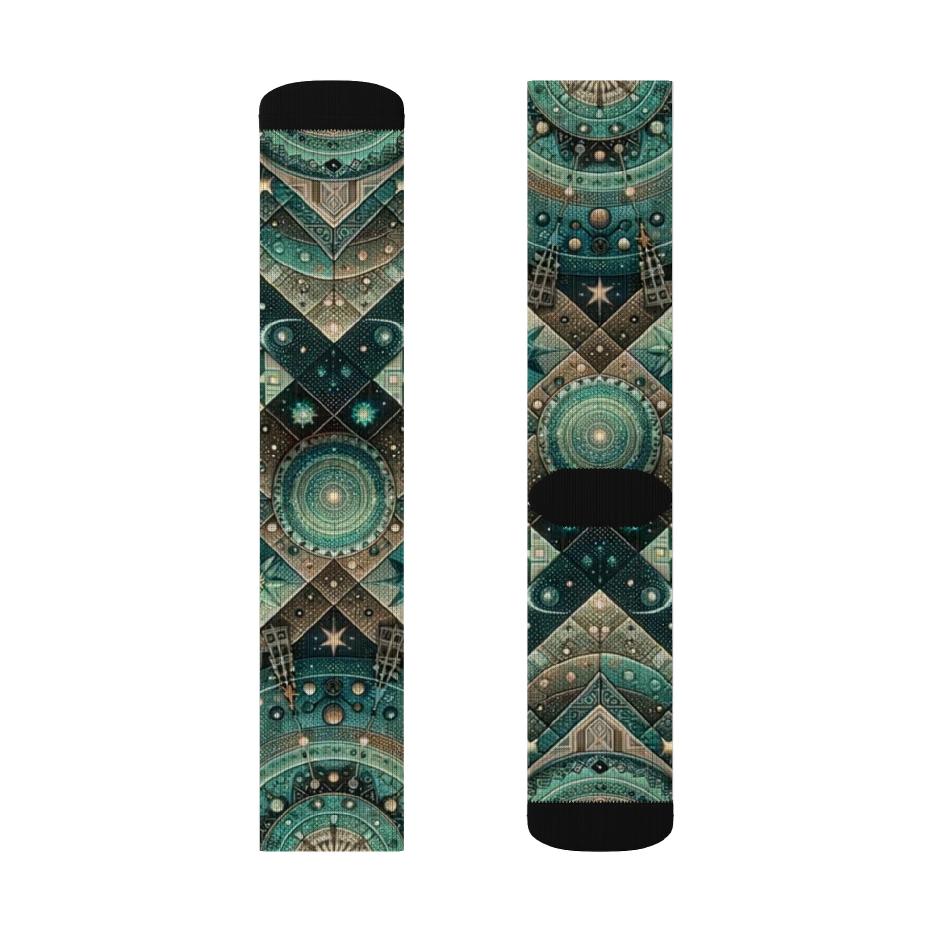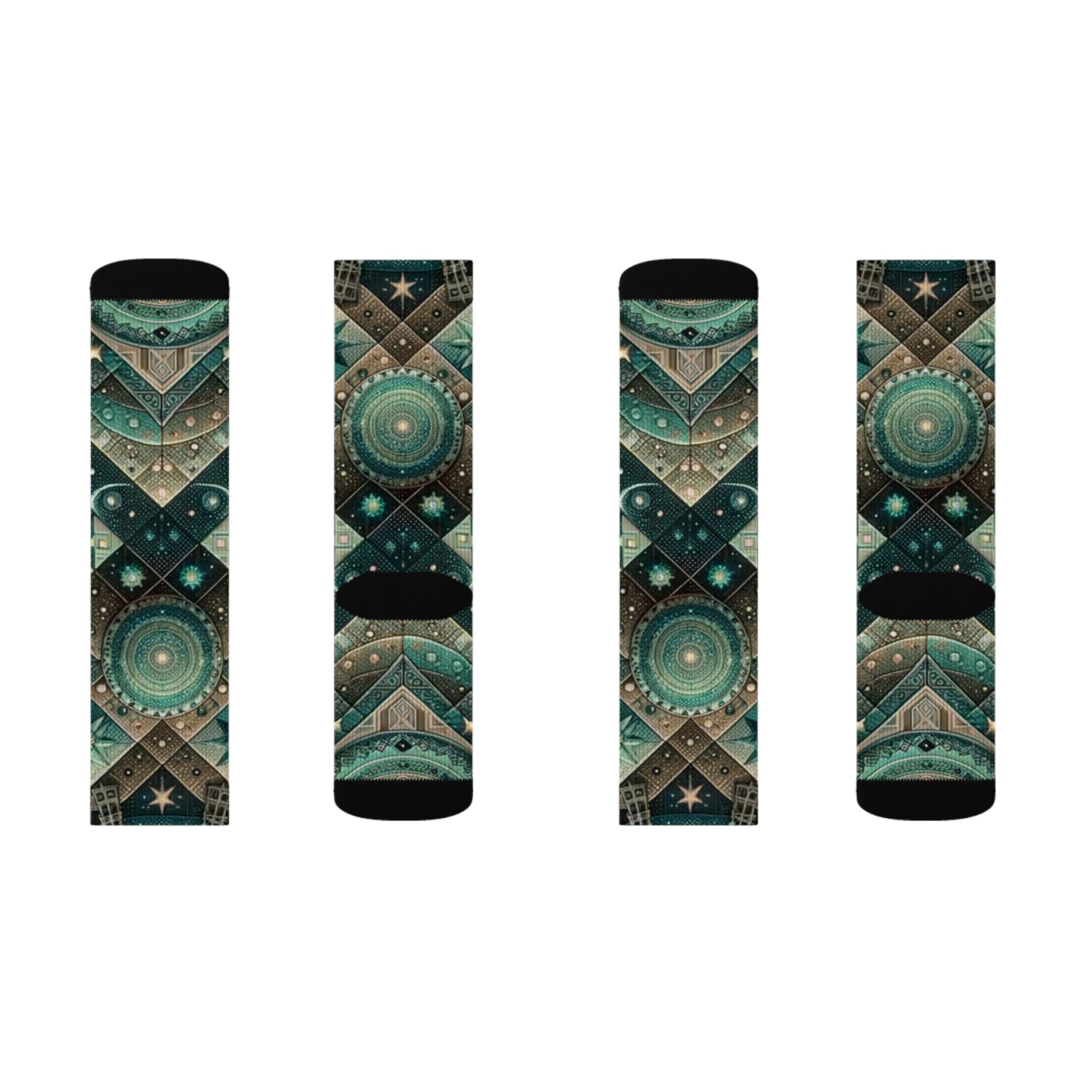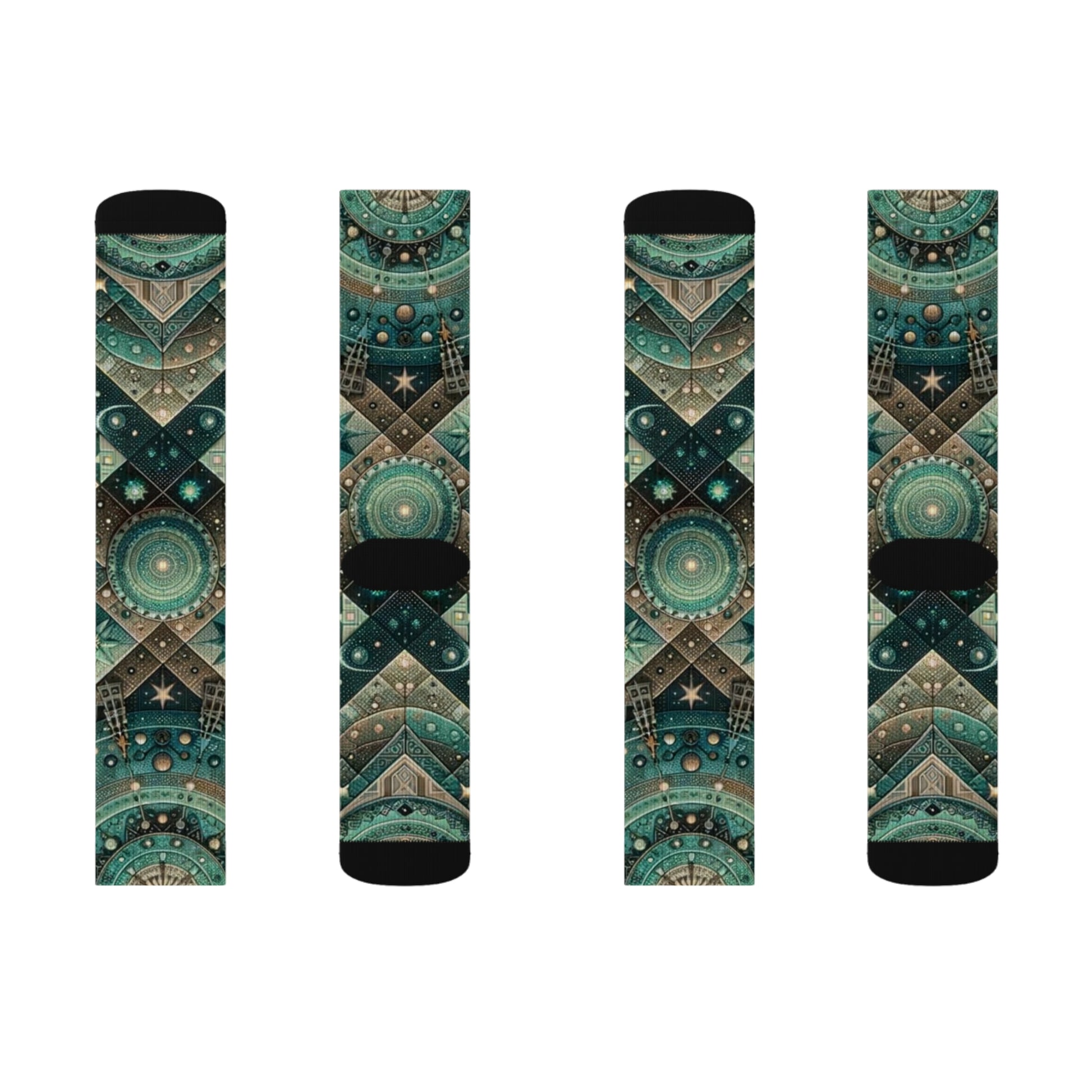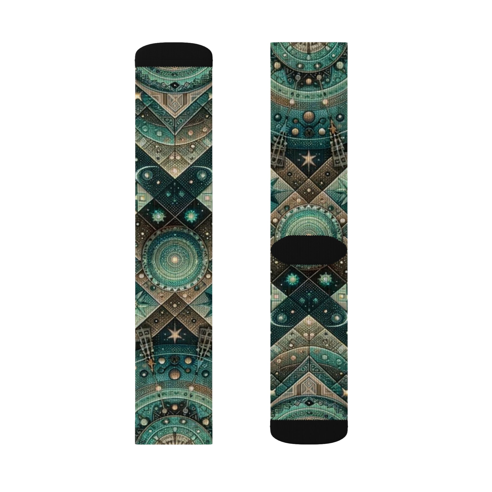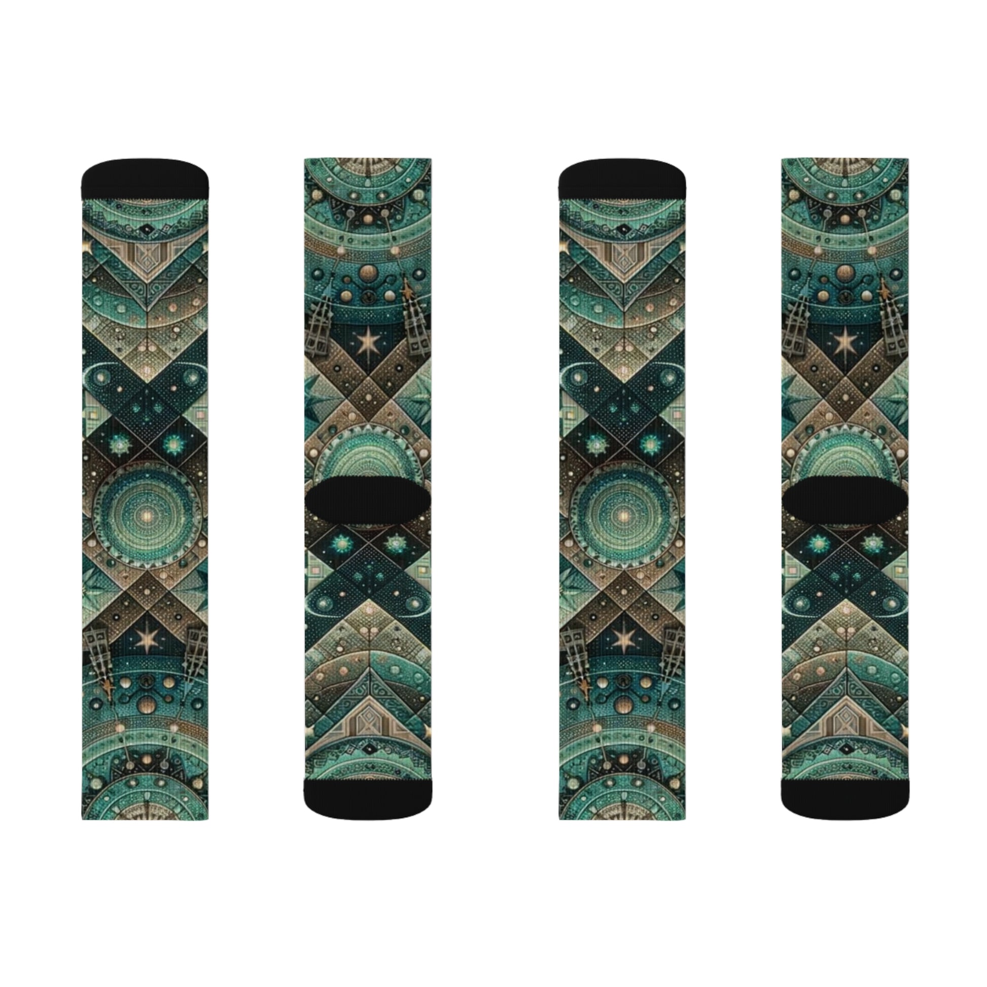 Unveil your cosmic spirit with these galaxy-themed socks! The dynamic turquoise canvas is engulfed by a quilted starry pattern and accented by southwestern Chevron lines. Explore the universe from your feet up! Ideal for stargazers and fans of intricate designs. #CosmicSocks #QuiltedPattern #EarthyVibe #TurquoisePalette #Galaxies #Nebulae #Planets #ChevronLines #UniverseAtYourFeet #Stargazers.