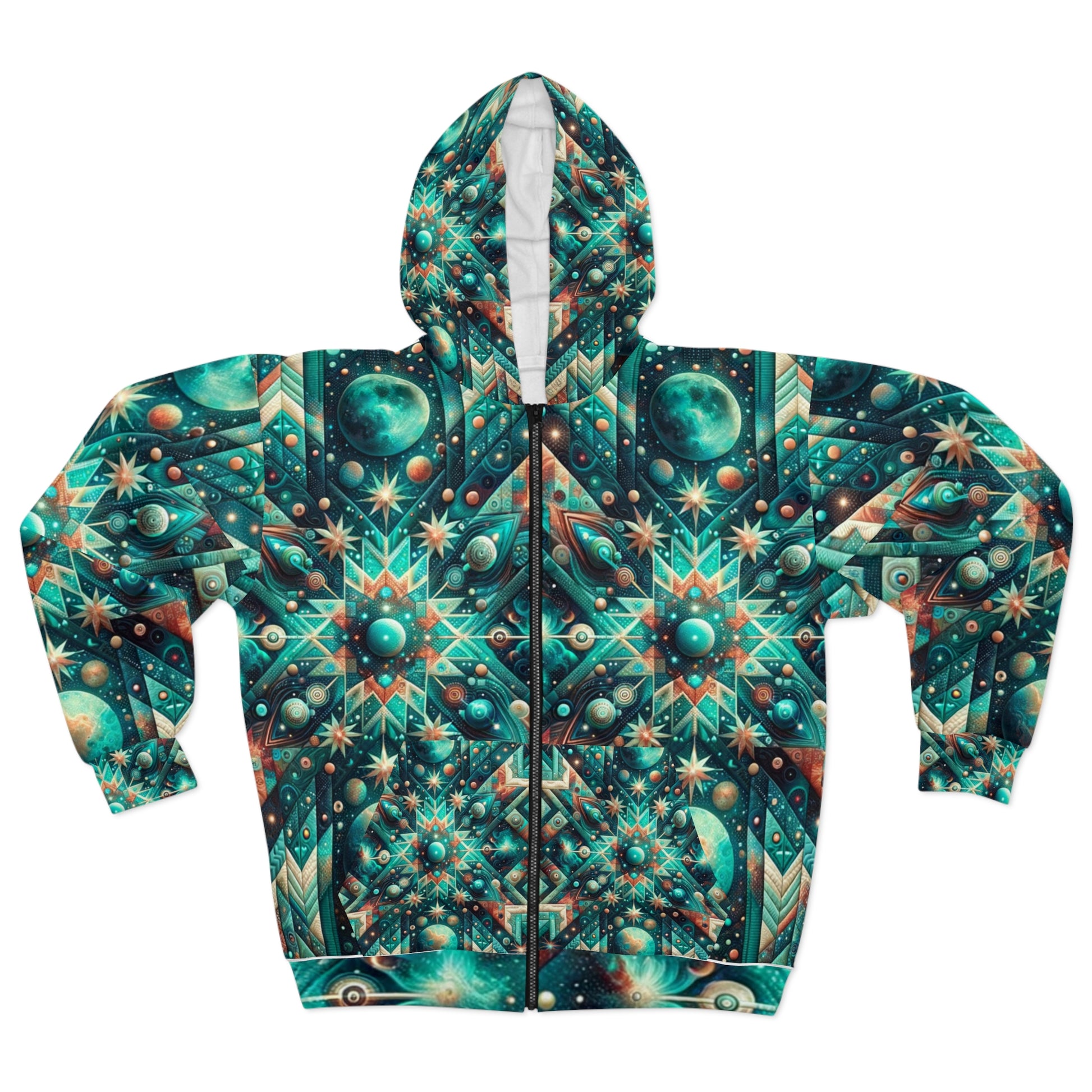 Indulge in the cosmic charm of our artfully quilted hoodie! Each stitch showcases a vibrant celestial scape, intricately interwoven with turquoise stars, galaxies, nebulae, and planets, offset by rustic Southwestern Chevron lines. No central focal point, only a seamless fusion of the out-of-this-world and earthly themes. #HoodieFashion #ArtisticPrint #CosmicDesign #QuiltedPattern #StarsandGalaxies #RusticChic #SouthwesternStyle #TurquoiseTrend #EarthlyAesthetic #PlanetaryFashion