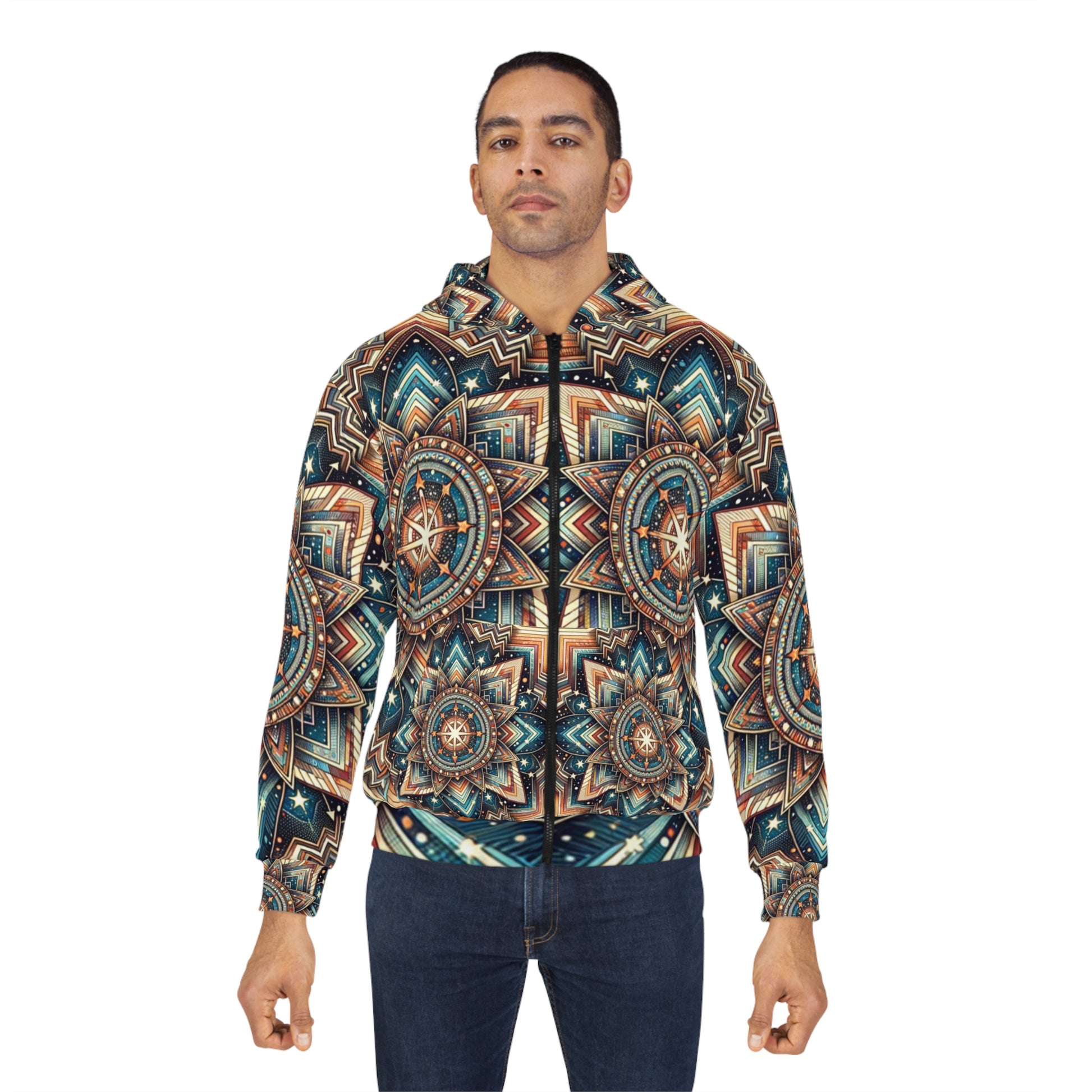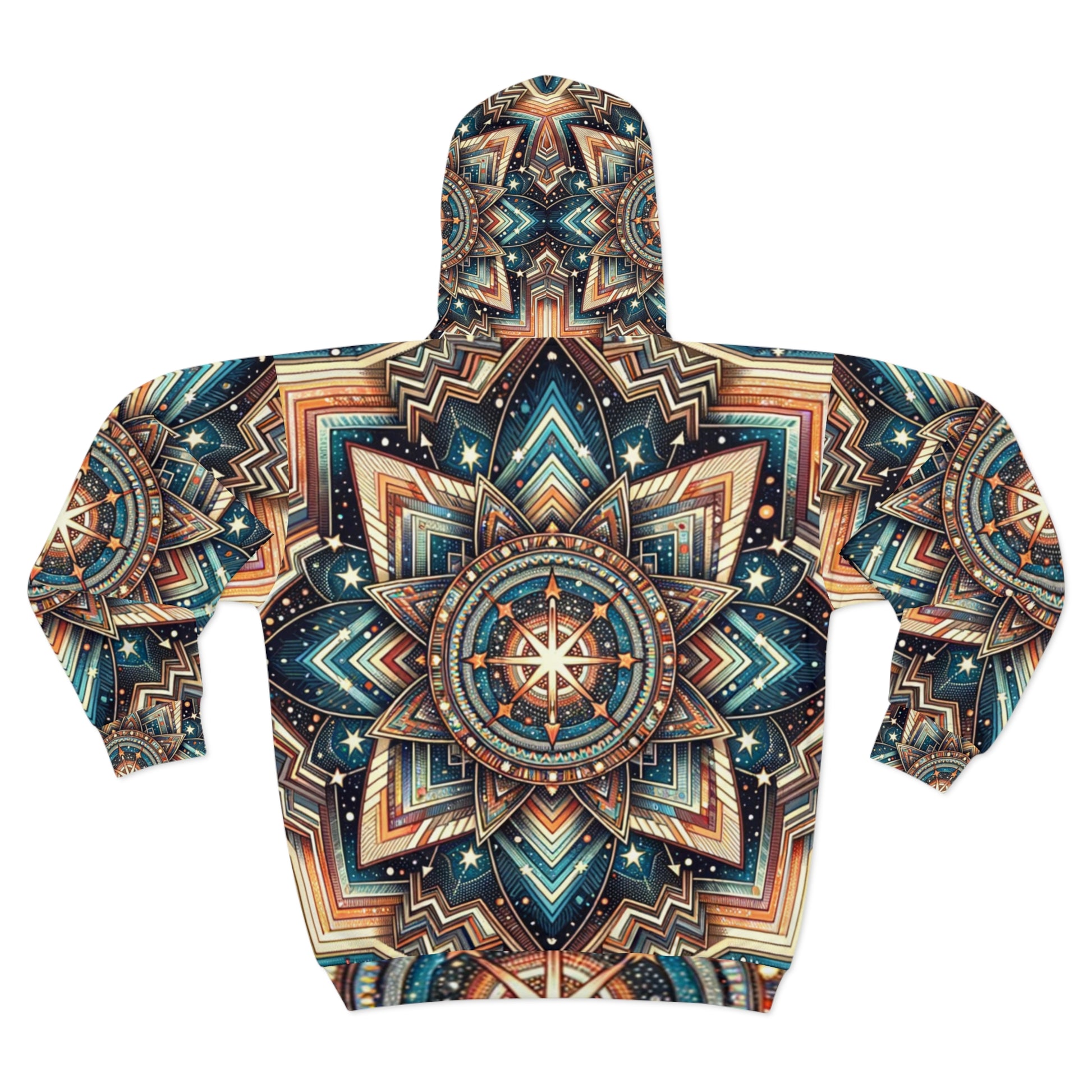 Our Cosmic Chevron Hoodie encompasses the cosmic wonders within its intricate Southwest Chevron design. Stars, galaxies, constellations are scattered making no central focal point on a backdrop of celestial hues, painting the night sky. This complex, but aesthetically pleasing hoodie brings the cosmos to your wardrobe.