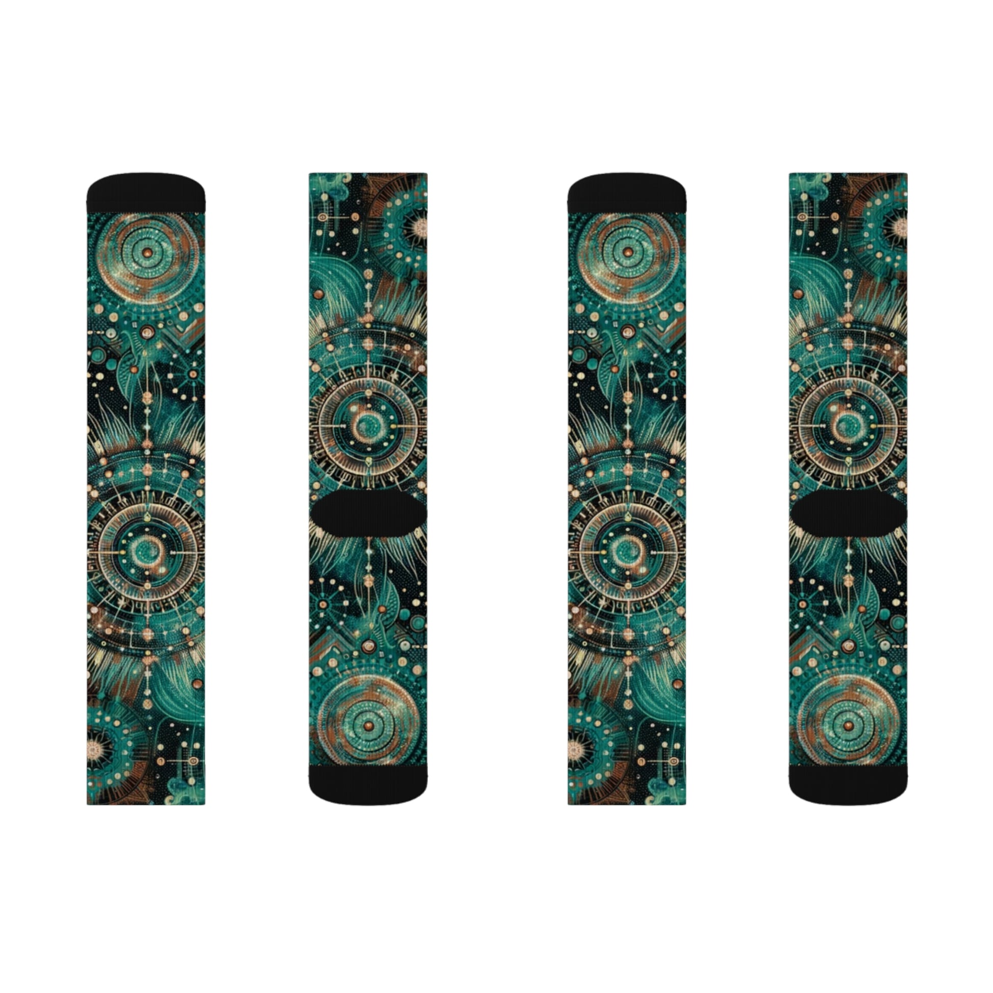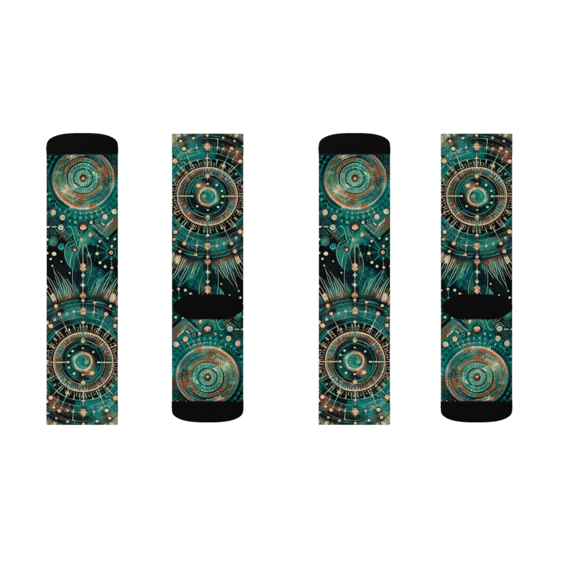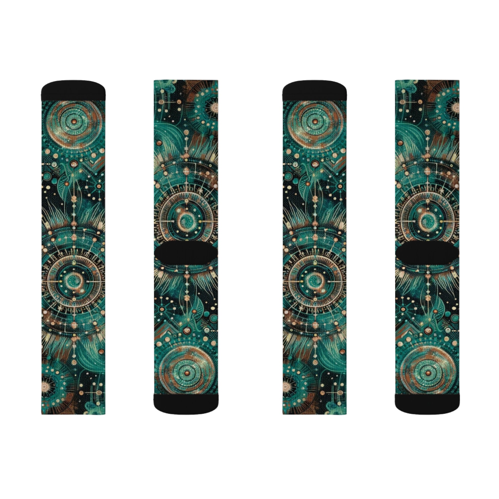 #AstroSocks #CelestialWear #VibrantFootwear #GalaxyFashion #StargazerStyle #EarthyTurquoise #NebulaSocks #SouthwesternChevron #CraftsmanshipWear #CosmicDesigns